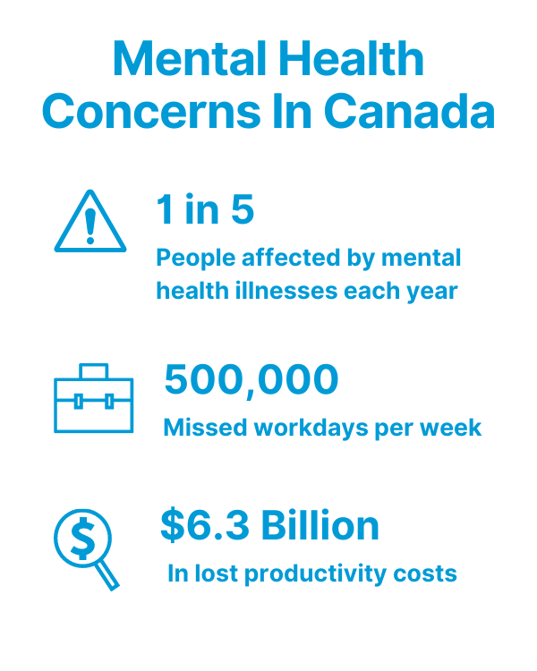 An infographic showing mental health statistics in Canada. Each year 1 in 5 Canadians are affected by a mental health illness. Canadians miss 500,000 workdays per week due to mental illnesses, accounting for 6.3 billion dollars in lost productivity costs.