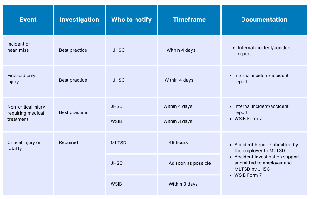Legally, critical injuries or fatalities must be reported to the MLITSD and investigated by the employer and JHSC. There is no requirement to report non-critical injuries or incidents to the MLITSD, but it is considered a best practice to investigate the incident to determine the causes to prevent future incidents.