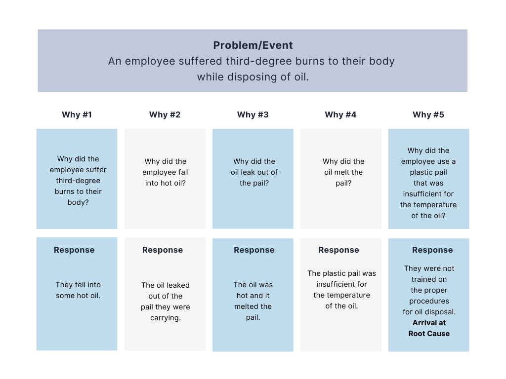 After most questions in your analysis, it’s important to ask the follow-up “why?” This will help you understand why an unsafe condition or behaviour was allowed to exist.