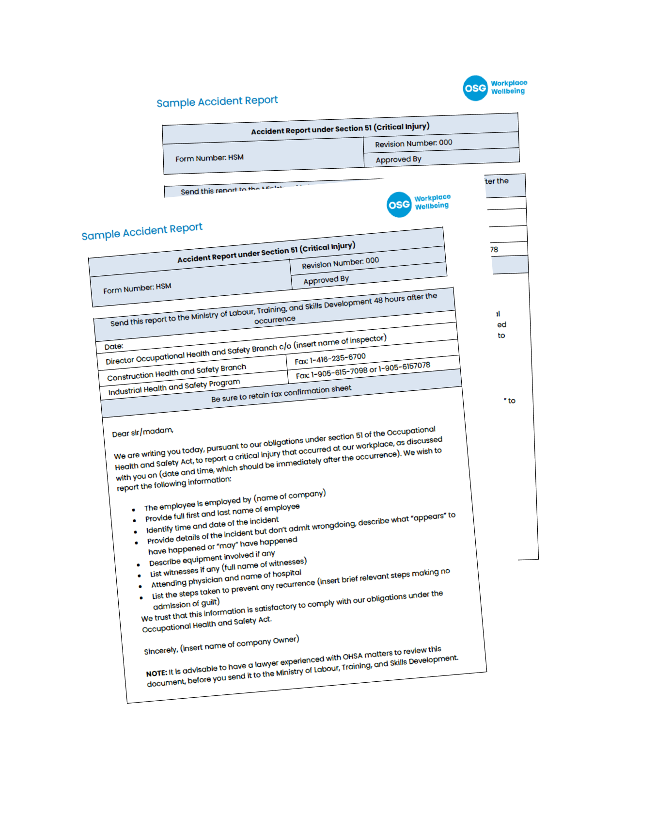 This sample template will help employers understand what to include in the accident report to comply with the requirements under Section 51 of the Occupational Health and Safety Act (OHSA).